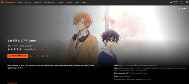 | Sasaki and Miyano | Wholesome Boys' Love (BL). A delicate story about two boys transitioning from friendship to romance. | Crunchyroll, Netflix | 4.9 (51.7k) |