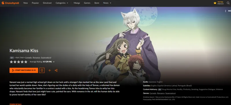 | Kamisama Kiss | Classic fantasy shoujo romance. A homeless girl becomes a land god and meets a fox spirit, leading to a heartwarming and magical love story. | Crunchyroll, Netflix, Hulu | 4.9 (39.9k) |