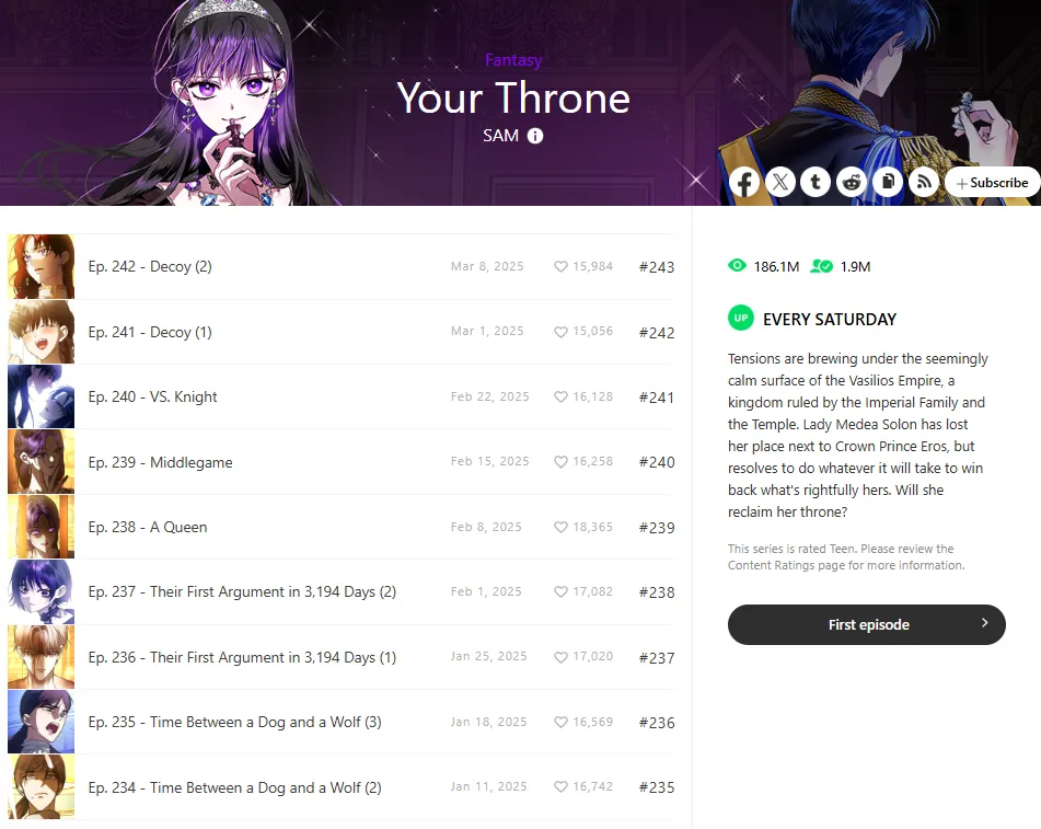 | Your Throne | Soul Swap, Power Struggle | Medeia Solon’s genius reaches its peak in the 2026 "Final Saga." | WEBTOON | 8.11 |