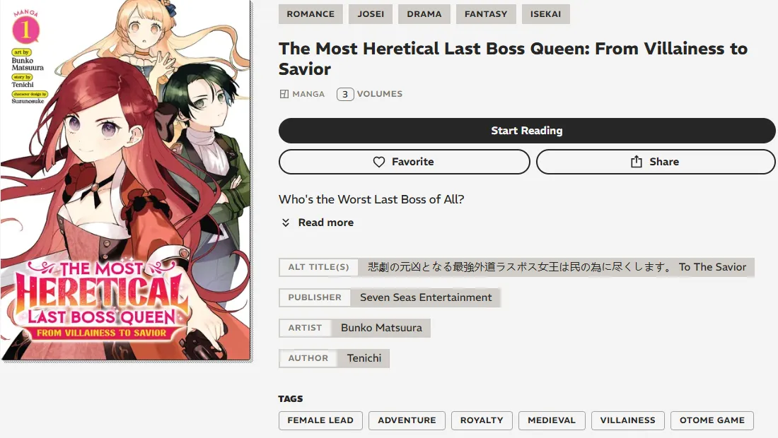 | The Most Heretical Last Boss Queen: From Villainess to Savior | Sacrifice, Redemption | 2026 Anime Season 2 news has kept this title trending. | Bookwalker | 7.41 |