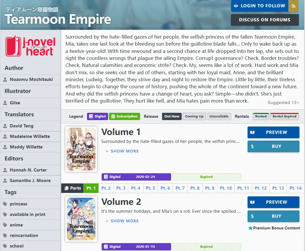 | Tearmoon Empire | Comedy, Misunderstanding | "Mia-sama" is the queen of failing upwards to save her head. | J-Novel | 7.66 |