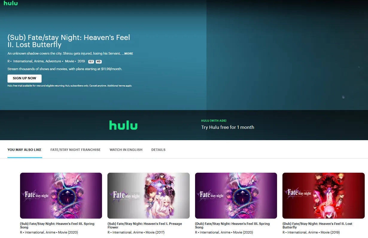 Basic Overview:Hulu is a major U.S.-based streaming platform providing licensed Fate series content such as Fate/Zero, Fate/stay night: Unlimited Blade Works, Fate/stay night: Heaven’s Feel I–III, and Fate/Apocrypha. The platform offers English dubbing and subtitles. Viewing requires a paid subscription. Hulu’s strengths include comprehensive official content and timely updates, making it suitable for viewers who want to binge multiple seasons. The primary limitation is its availability, restricted to the U.S., requiring a VPN for international access. It is best suited for English-speaking users or those prioritizing official, high-quality streaming.