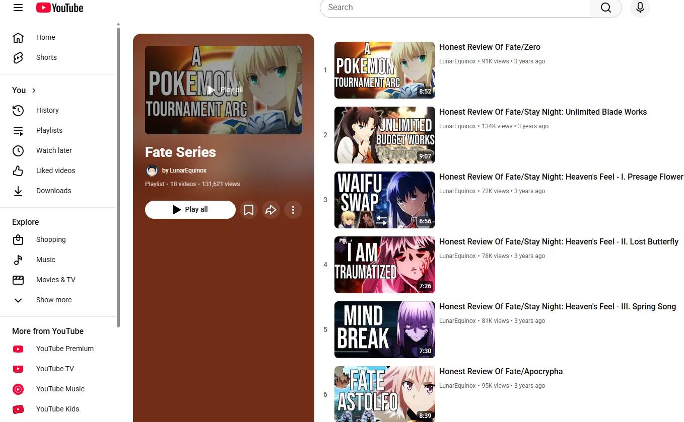 Basic Overview:YouTube’s official channels provide promotional videos (PVs), trailers, and short clips from the Fate series. In addition, some independent content creators and fan channels upload episodes, clips, and discussions about Fate, although these are unofficial and may be taken down due to copyright. Official content ensures high quality and legality, while fan uploads may include full episodes but come with risks such as removal or unstable quality. YouTube is ideal for catching previews, trailers, and fan content, but not suitable for watching the complete series reliably.