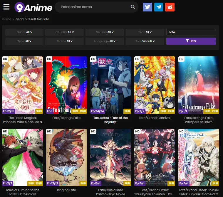 Basic Overview:9anime is a well-known unofficial streaming site that offers all seasons and movies of the Fate series, including Fate/stay night (Fate Route), Unlimited Blade Works, Heaven’s Feel, Fate/Zero, Fate/Grand Order, Fate/Apocrypha, and other Grand Order movies. New episodes and films are often uploaded shortly after their official release. While the site provides free access, it is ad-supported and unofficial, meaning content can be removed at any time, video quality may vary, and there are potential legal or security risks.