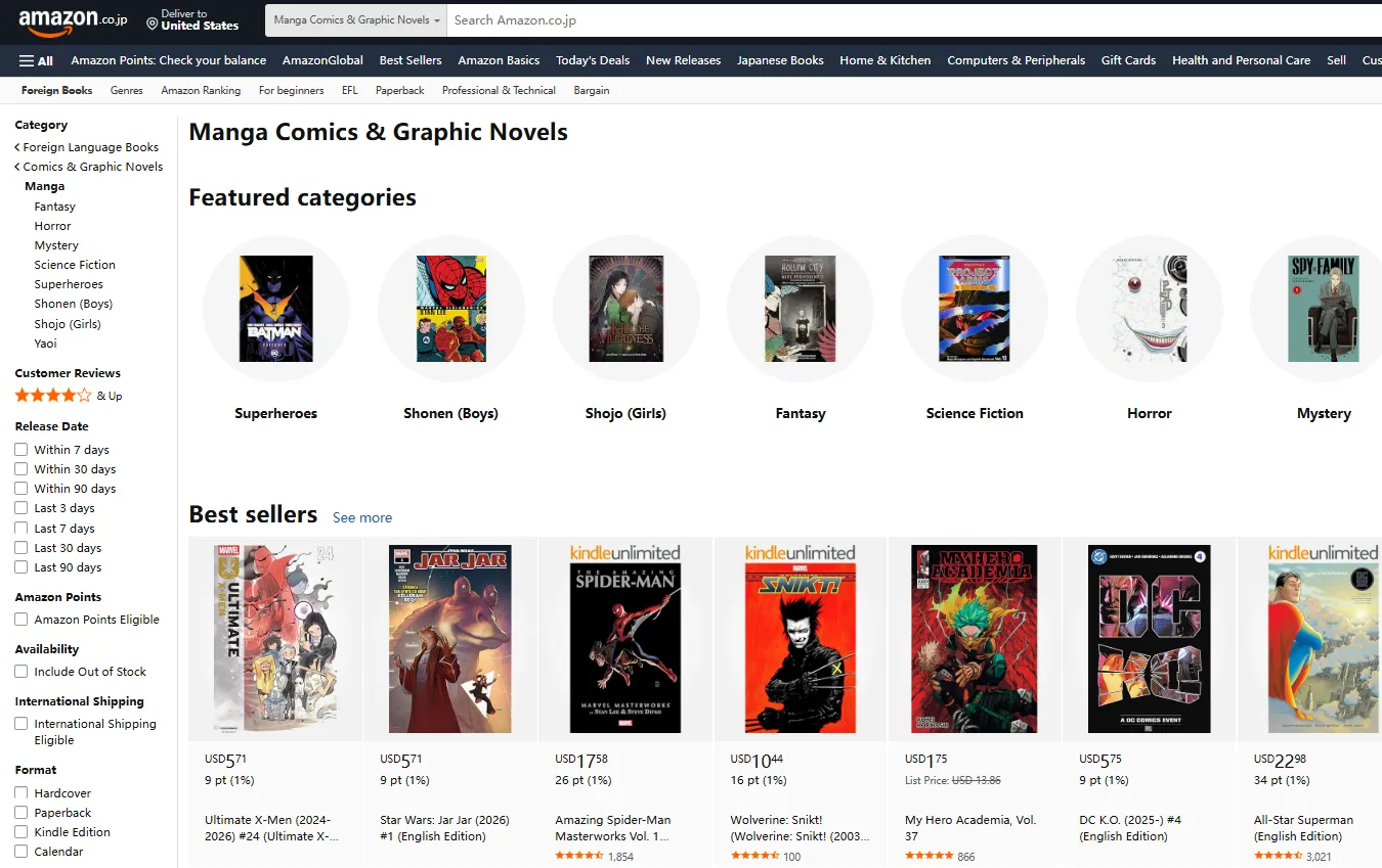 Basic Overview:While Amazon Japan looks like other Amazon sites, it operates as a separate entity. It is the most streamlined way for international fans to buy original Japanese-language manga (Tankobon), magazines (like Weekly Shonen Jump), and Japanese artbooks. The interface can be easily toggled to English, making it incredibly user-friendly for non-Japanese speakers.