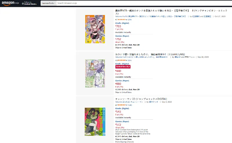 Basic Overview:Amazon Japan provides a convenient and reliable platform for purchasing manga, both new and secondhand. While secondhand options are somewhat more expensive than specialized sites, the platform is known for its smooth logistics and large selection. Some items are eligible for international shipping, making it easier for overseas buyers to order directly without a proxy service.